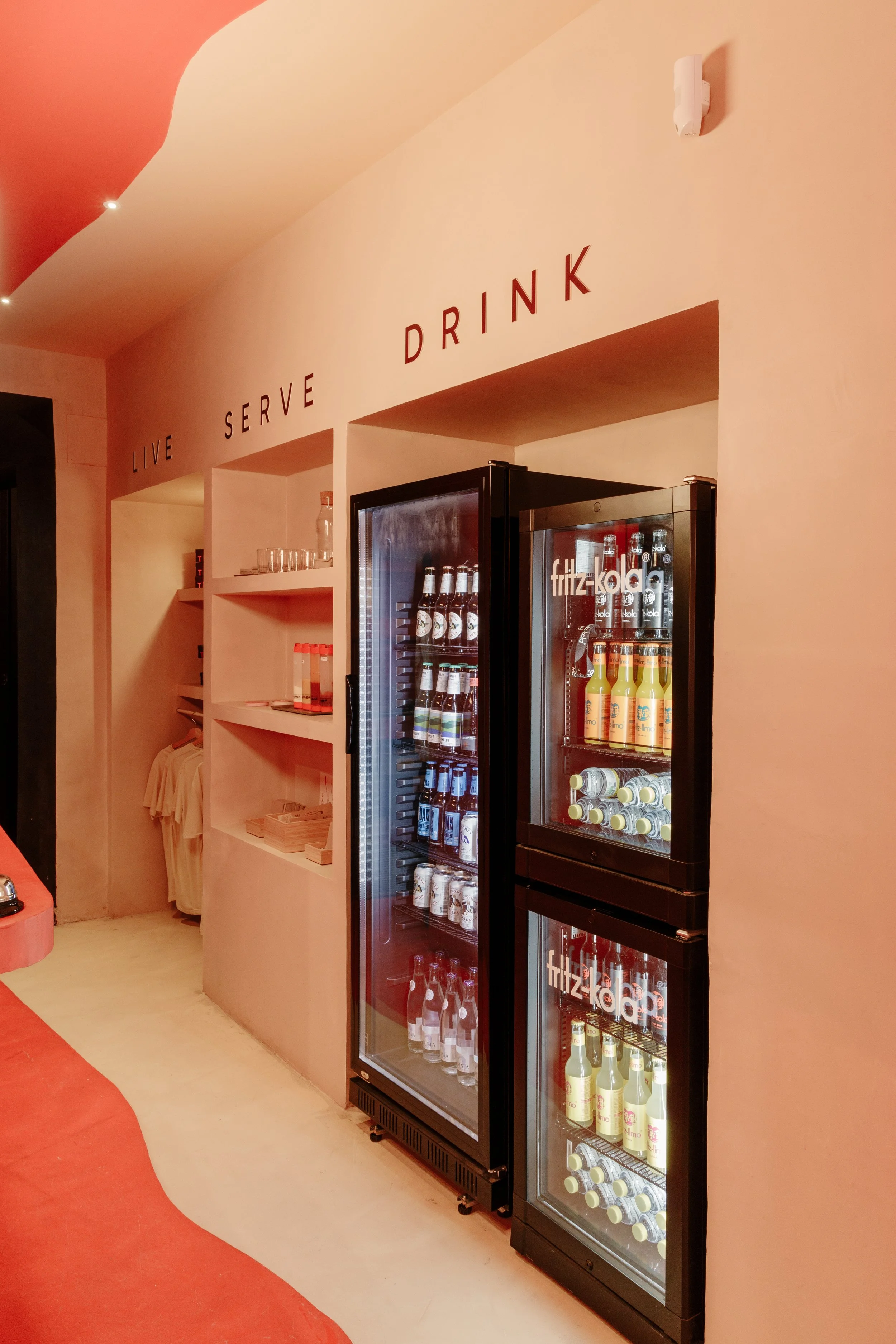 Il prodotto — e in particolare la sua doppia natura — è diventato il punto di partenza per l’intero concept di interior design e per il branding. Questo approccio si riflette in ogni dettaglio dello spazio: nelle linee fluide del pavimento che alternano due colori, nei volumi accoppiati, nelle forme specchiate e nei percorsi che si sdoppiano creando una vera e propria esperienza a “due strati”. Ogni elemento è stato pensato per rievocare la dualità del prodotto, trasformando il gesto semplice di mangiare un hot dog in un rituale immersivo e giocoso.